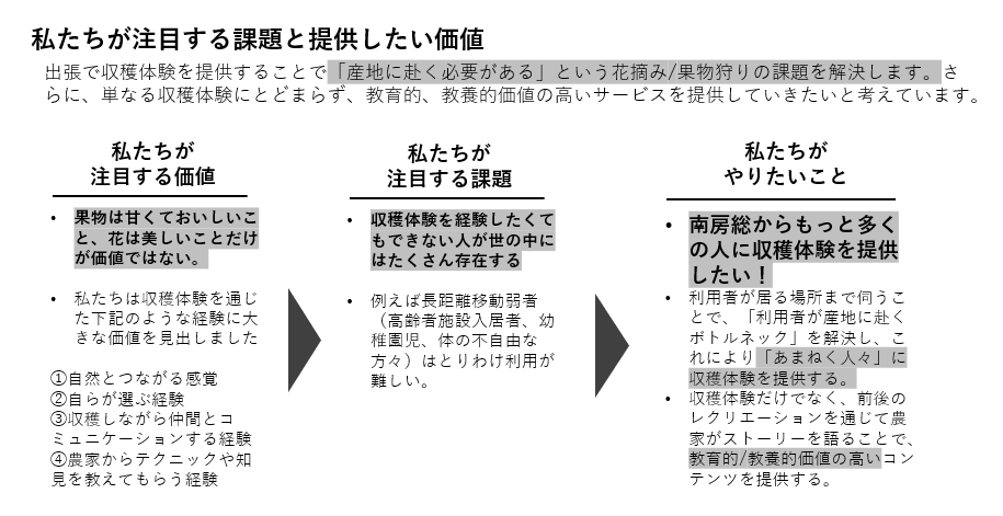 •利用者が居る場所まで伺うことで、「利用者が産地に赴くボトルネック」を解決し、これにより「あまねく人々」に収穫体験を提供する。